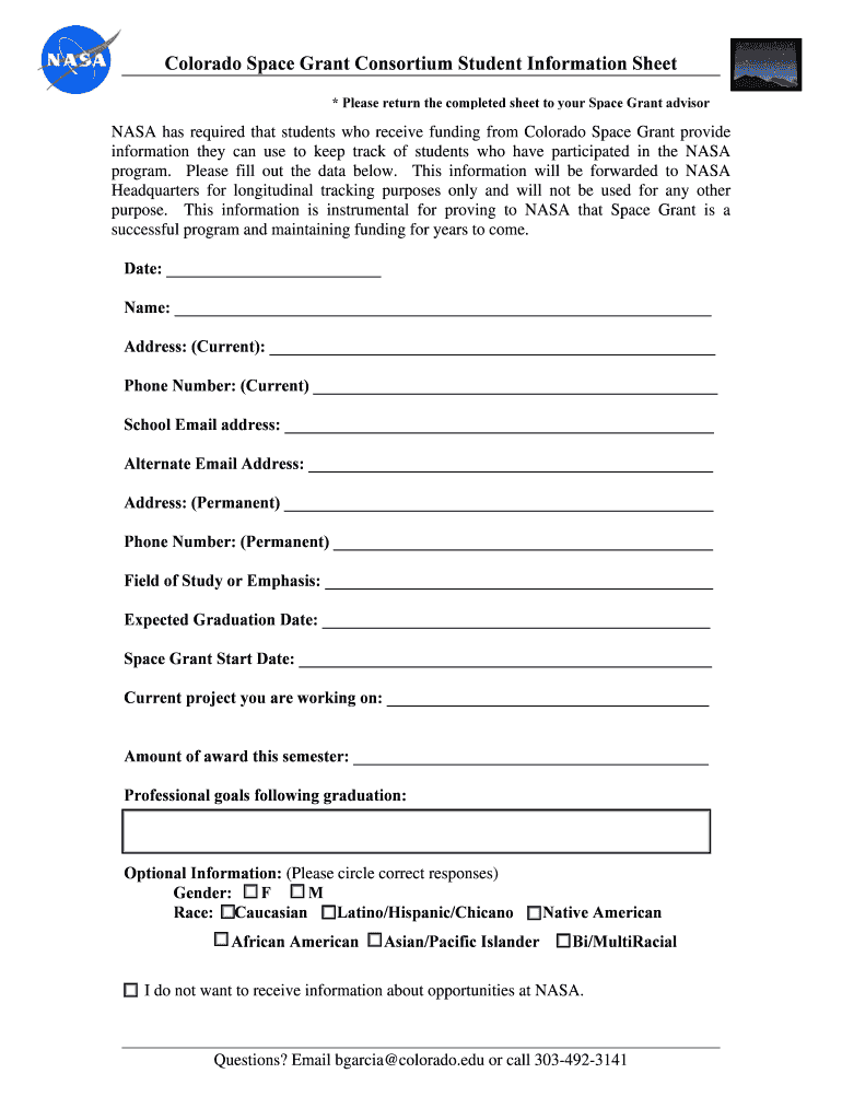 Colorado Space Grant Consortium Student Information Sheet * Please return the completed sheet to your Space Grant advisor NASA has required that students who receive funding from Colorado Space Grant