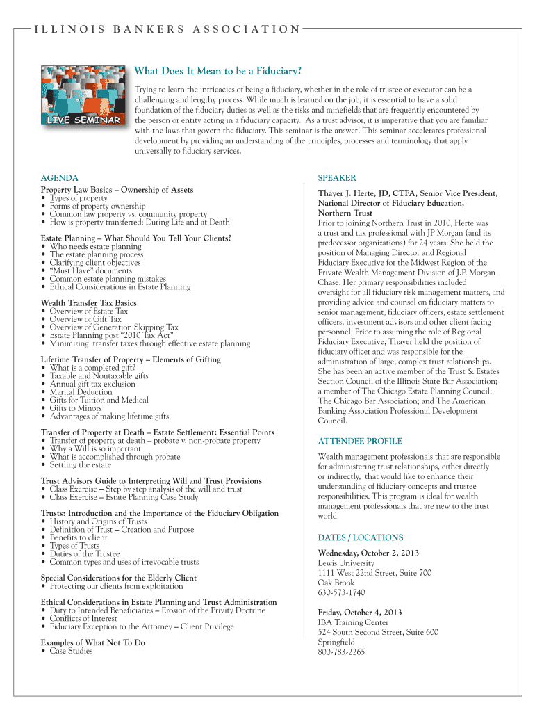 I L L I N O I S B A N K E R S A S S O C I AT I O N What Does It Mean to be a Fiduciary? Trying to learn the intricacies of being a fiduciary, whether in the role of trustee or executor can be a challenging