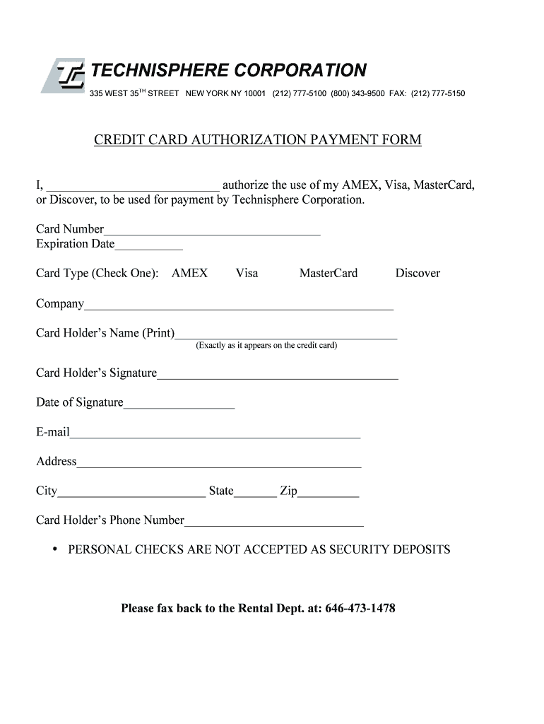 The Credit Card Authorization Payment Form is a crucial document used to authorize payments via credit card at Technisphere Corporation. Its primary purpose is to securely validate transactions, ensuring that payments can be processed smoothly on behalf of customers. This form plays an essential role in facilitating payment authorization, offering a reliable method for businesses to manage transactions efficiently.