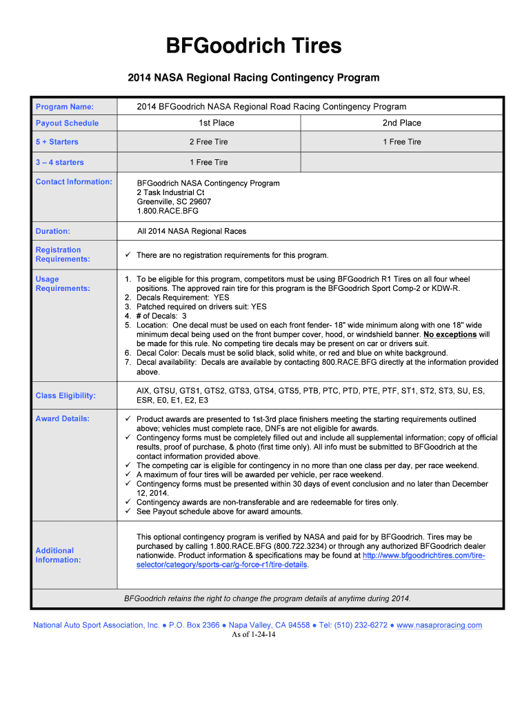 Get the BFGoodrich Tires 2014 NASA Regional Racing Contingency Program Program Name: Payout Sched...