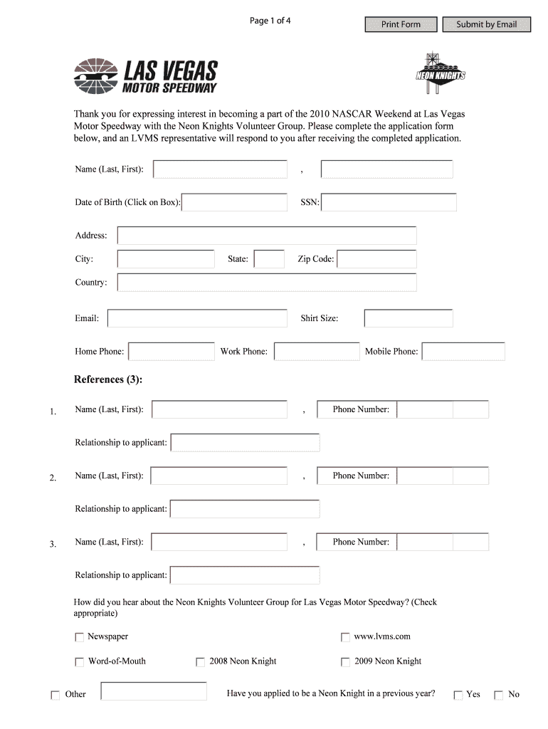 The 2010 NASCAR Weekend Volunteer Application is a personal form used by individuals seeking to volunteer with the Neon Knights Volunteer Group at Las Vegas Motor Speedway.
