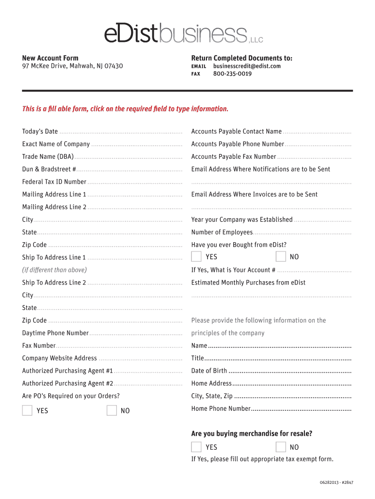 , LLC New Account Form 97 McKee Drive, Yahweh, NJ 07430 Return Completed Documents to: email business credit edist.com fax 8002350019 This is a fill able form, click on the required field to type