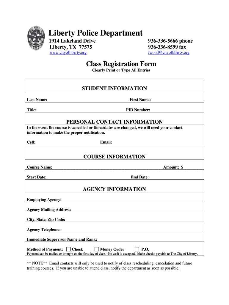 Liberty Police Department 1914 Lakeland Drive Liberty, TX 77575 9363365666 phone 9363368599 fax www.cityofliberty.org Food cityofliberty.org Class Registration Form Clearly Print or Type All Entries
