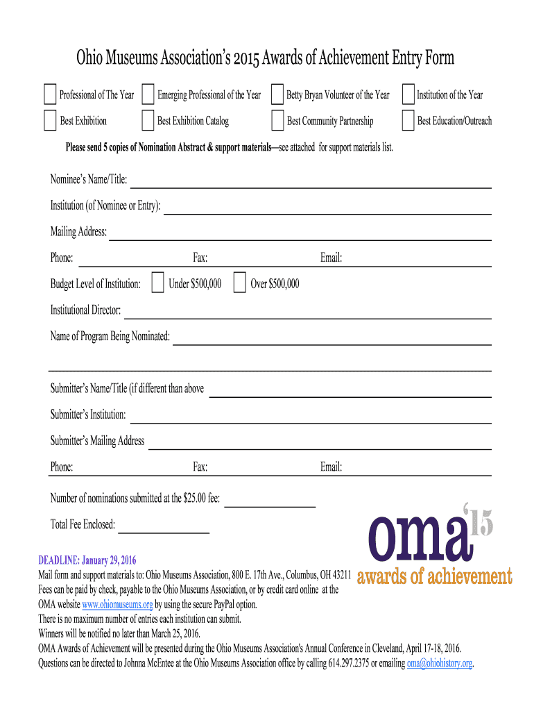 Get the free Ohio Museums Association's 2015 Awards of Achievement Entry Form