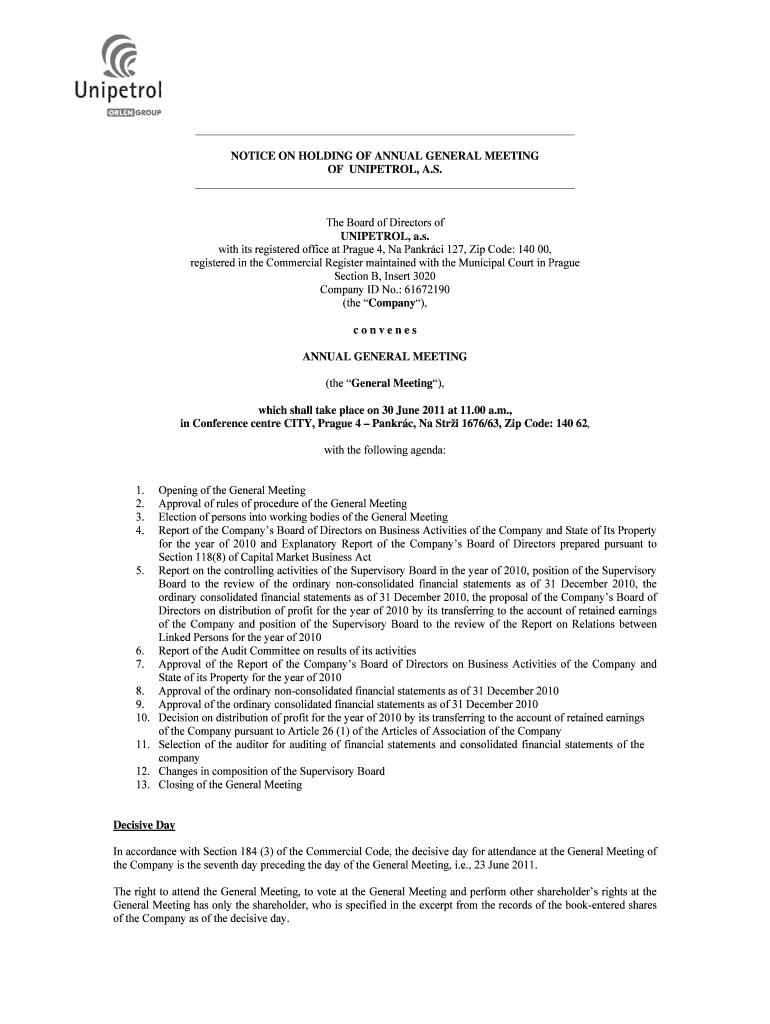 Get the free NOTICE ON HOLDING OF ANNUAL GENERAL MEETING OF UNIPETROL - unipetrol