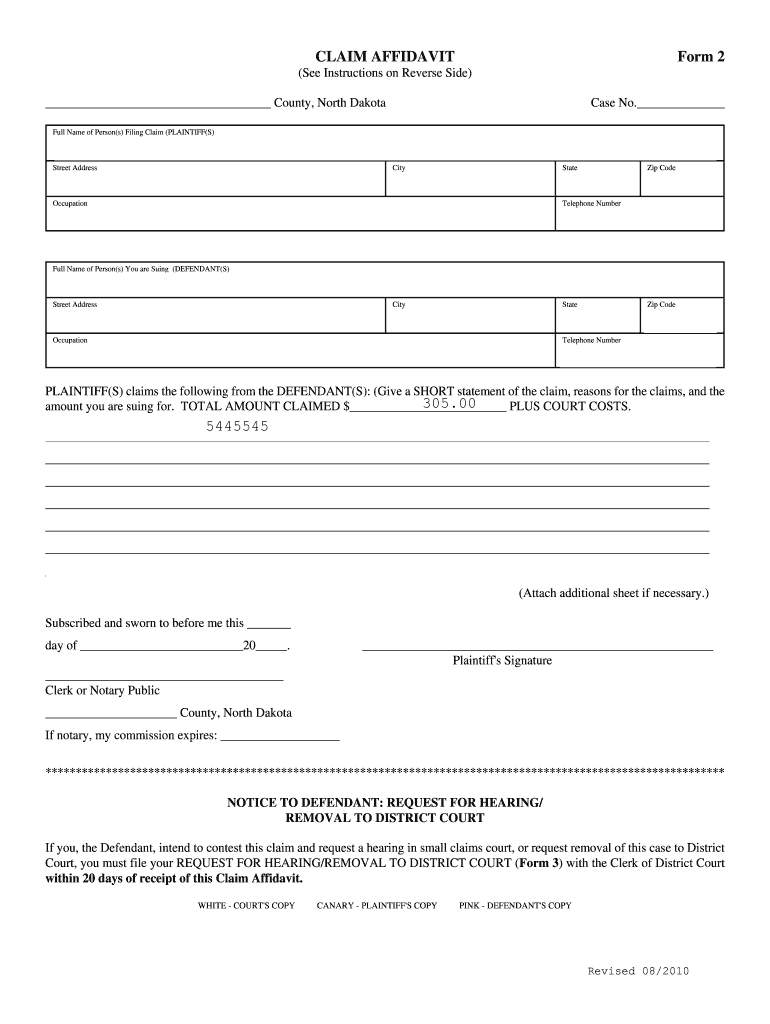 The Claim Affidavit Form 2 is a legal document used by plaintiffs in North Dakota to file a claim against another party in small claims court.