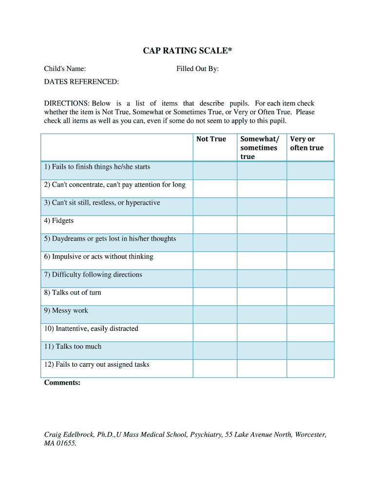 CAP RATING SCALE* Child's Name: Filled Out By: DATES REFERENCED: DIRECTIONS: Below is a list of items that describe pupils. For each item check whether the item is Not True, Somewhat or Sometimes