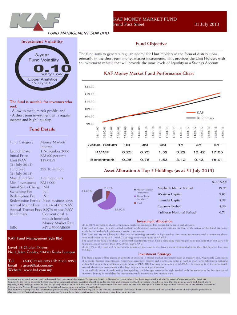 AF MONEY MARKET FUND Fact Sheet 31 July 2013 FUND MANAGEMENT SDN BHD Investment Volatility Fund Objective The fund aims to generate regular income for Unit Holders in the form of distributions primarily