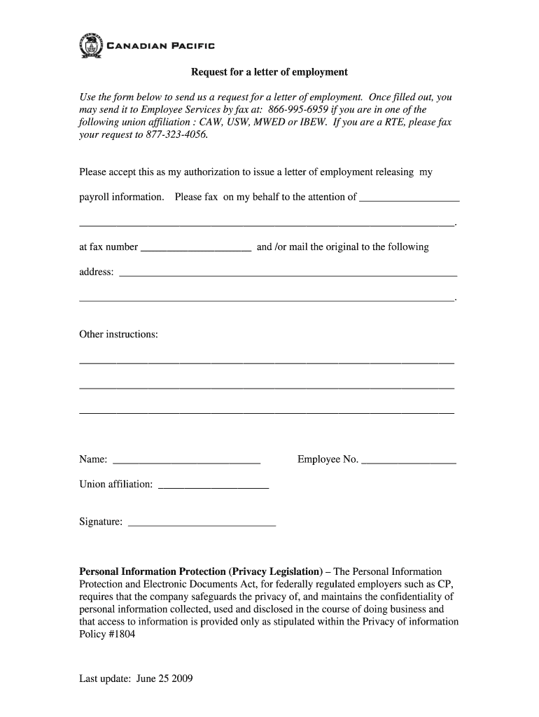 Request for a letter of employment Use the form below to send us a request for a letter of employment. Once filled out, you may send it to Employee Services by fax at: 8669956959 if you are in one