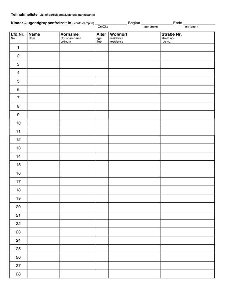 Teilnahmeliste (List of participants×List DES participants) Kinder×Jugendgruppenfreizeit in (Youth camp in) ORT×City Begins End start (from) end (until) Led. NR. Name Surname Alter Cohort Straw