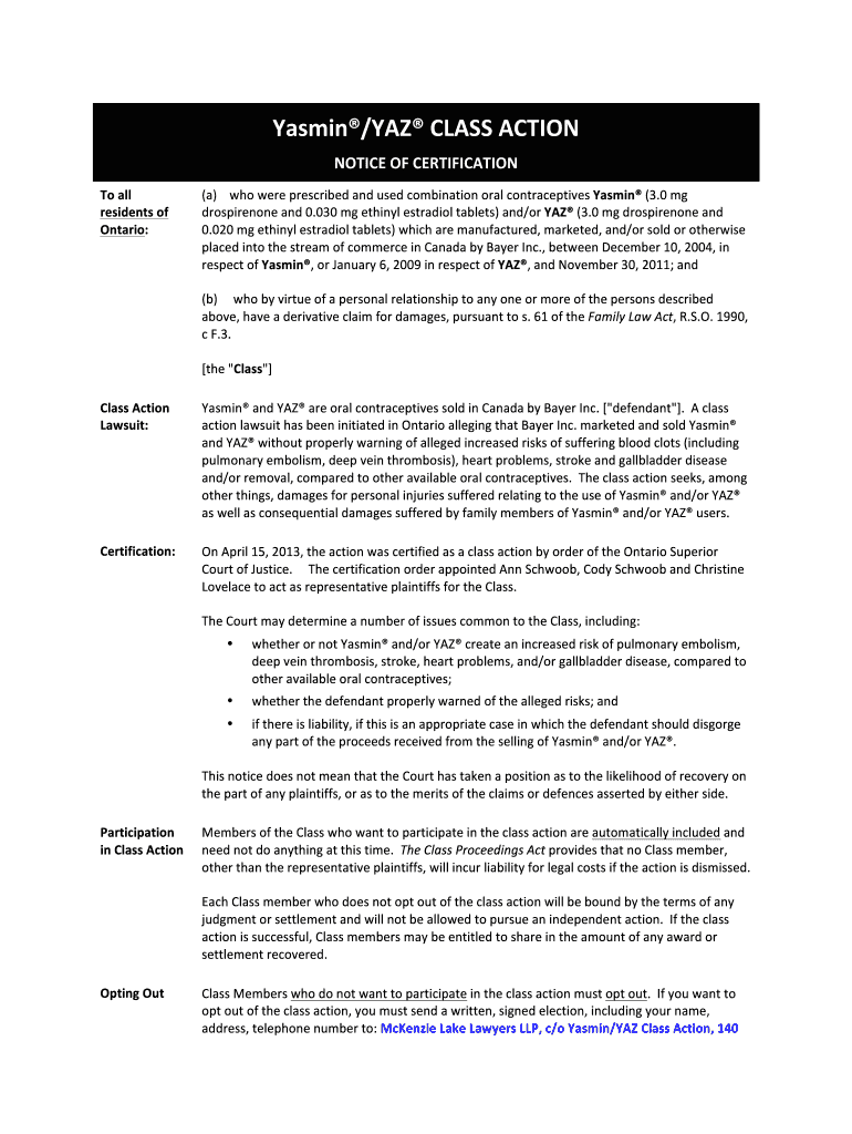 Yasmin×YAM CLASS ACTION NOTICE OF CERTIFICATION To all residents of Ontario: (a) who were prescribed and used combination oral contraceptives Yasmin (3.0 mg drospirenone and 0.030 mg ethanol estradiol