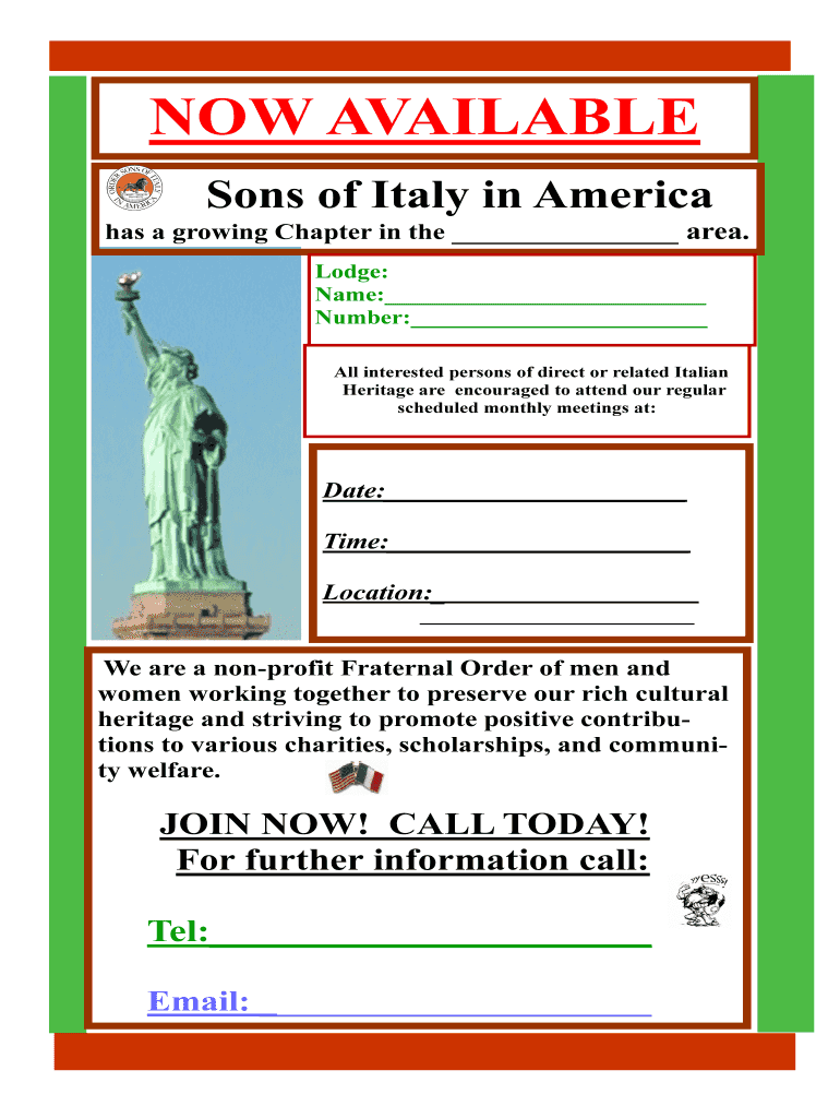 NOW AVAILABLE. All interested persons of direct or related Italian. Heritage are encouraged to attend our regular scheduled monthly meetings at: