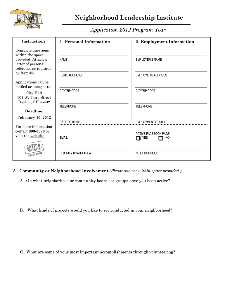Obtain the Neighborhood Leadership Institute Application form for the 2012 Program Year.