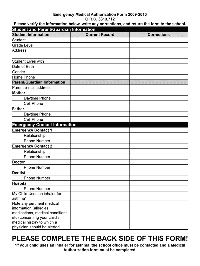 Who is required to file Emergency Medical Authorization Form 2009-2010?