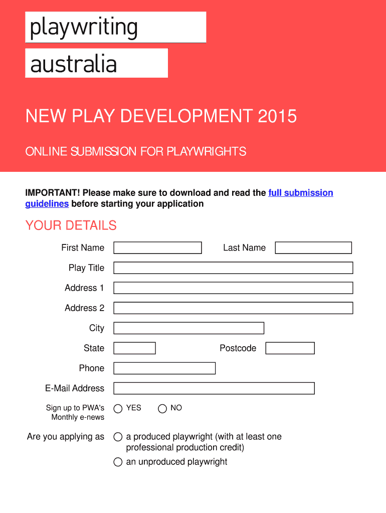 NEW PLAY DEVELOPMENT 2015 ONLINE SUBMISSION FOR PLAYWRIGHTS IMPORTANT! Please make sure to download and read the full submission guidelines before starting your application YOUR DETAILS First Name