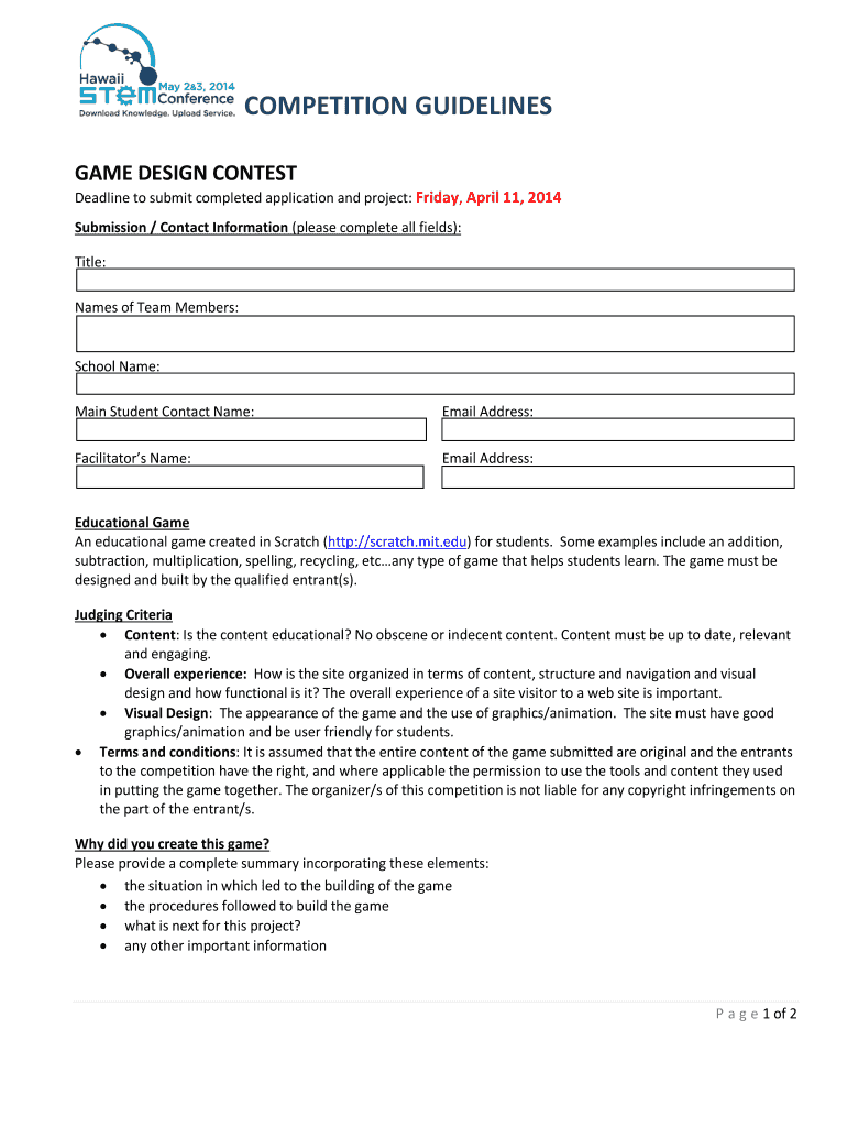 COMPETITION GUIDELINES GAME DESIGN CONTEST Deadline to submit completed application and project: Friday, April 11, 2014, Submission / Contact Information (please complete all fields): Title: Names
