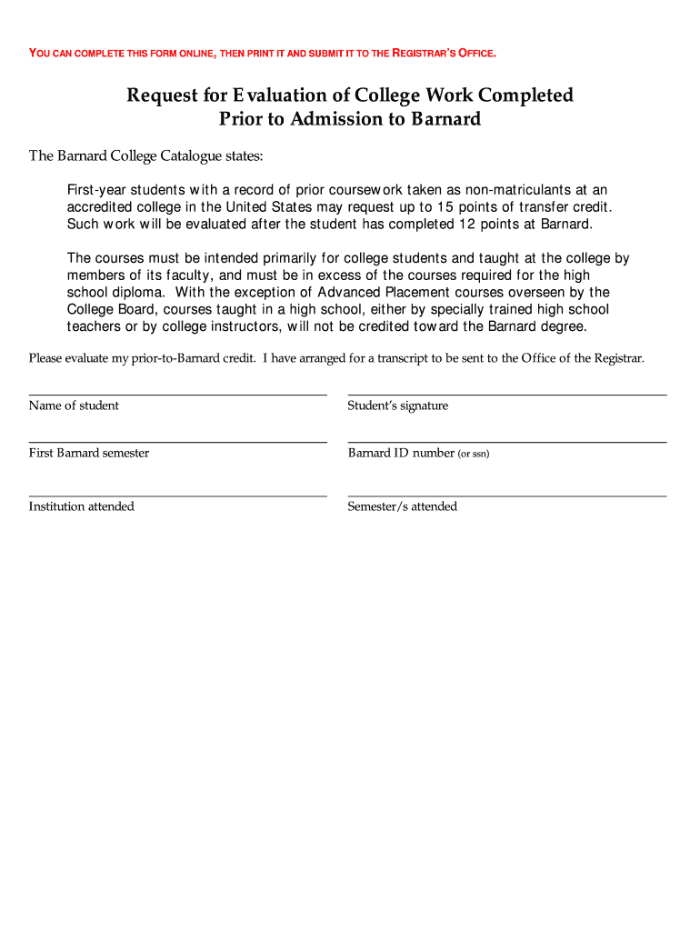 YOU CAN COMPLETE THIS FORM ONLINE, THEN PRINT IT AND SUBMIT IT TO THE REGISTRARS OFFICE. Request for Evaluation of College Work Completed Prior to Admission to Barnard The Barnard College Catalog