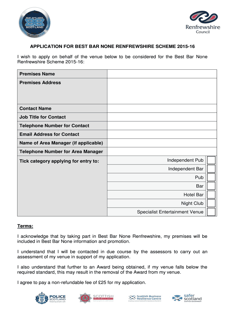 APPLICATION FOR BEST BAR NONE RENFREWSHIRE SCHEME 201516 I wish to apply on behalf of the venue below to be considered for the Best Bar None Renfrewshire Scheme 201516: Premises Name Premises Address