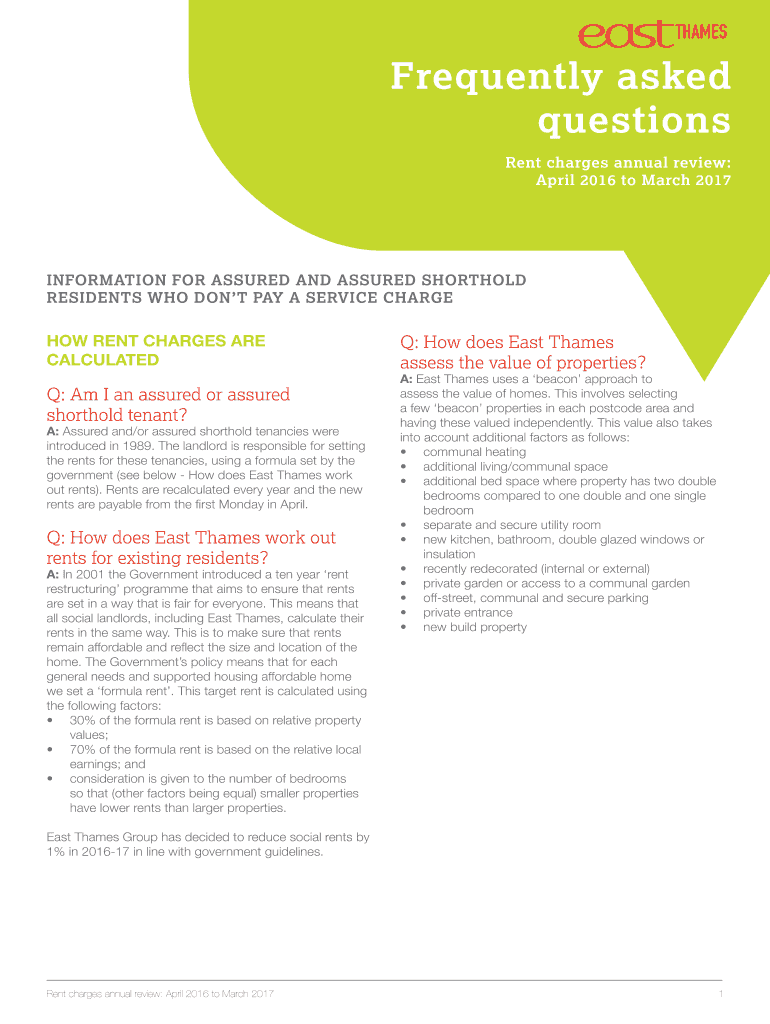 THAMES Frequently asked questions Rent charges annual review: April 2016 to March 2017 INFORMATION FOR ASSURED AND ASSURED SHORTHAND RESIDENTS WHO DON'T PAY A SERVICE CHARGE HOW RENT CHARGES ARE CALCULATED