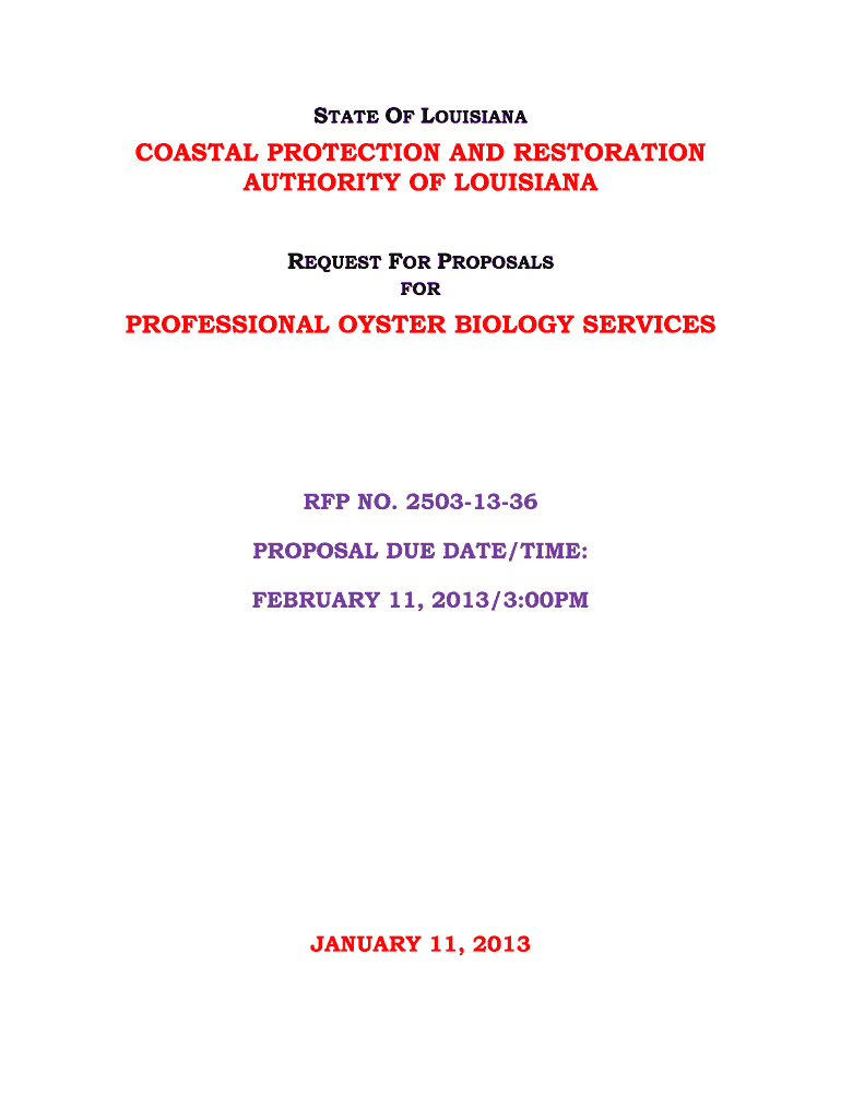 STATE OF LOUISIANA COASTAL PROTECTION AND RESTORATION AUTHORITY OF LOUISIANA REQUEST FOR PROPOSALS FOR PROFESSIONAL OYSTER BIOLOGY SERVICES RFP NO. 2503-13-36 PROPOSAL DUE DATE×TIME: FEBRUARY 11,