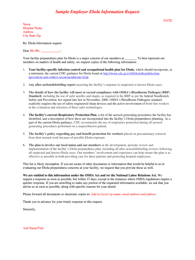 Sample Employer Ebola Information Request DATE Name Hospital Name Address City State Zip Re: Ebola Information request Dear Mr.×Ms. : Your facility preparedness plan for Ebola is a major concern
