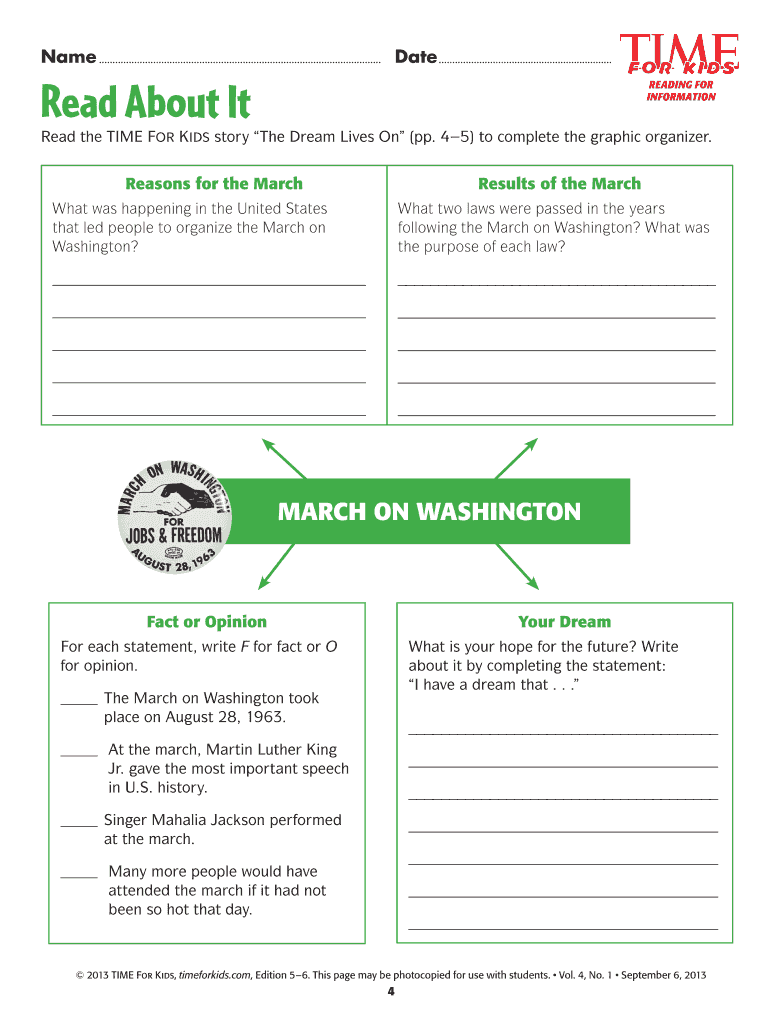Name Date Read About It READING FOR INFORMATION Read the TIME FOR KIDS story The Dream Lives On (pp. 45) to complete the graphic organizer. Reasons for the March Results of the March What was happening