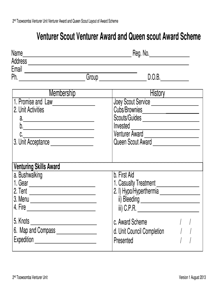 2nd Toowoomba Venture Unit Venture Award and Queen Scout Layout of Award Scheme Venture Scout Venture Award and Queen scout Award Scheme Name Reg. No. Address Email pH. Group D.O.B. Membership History