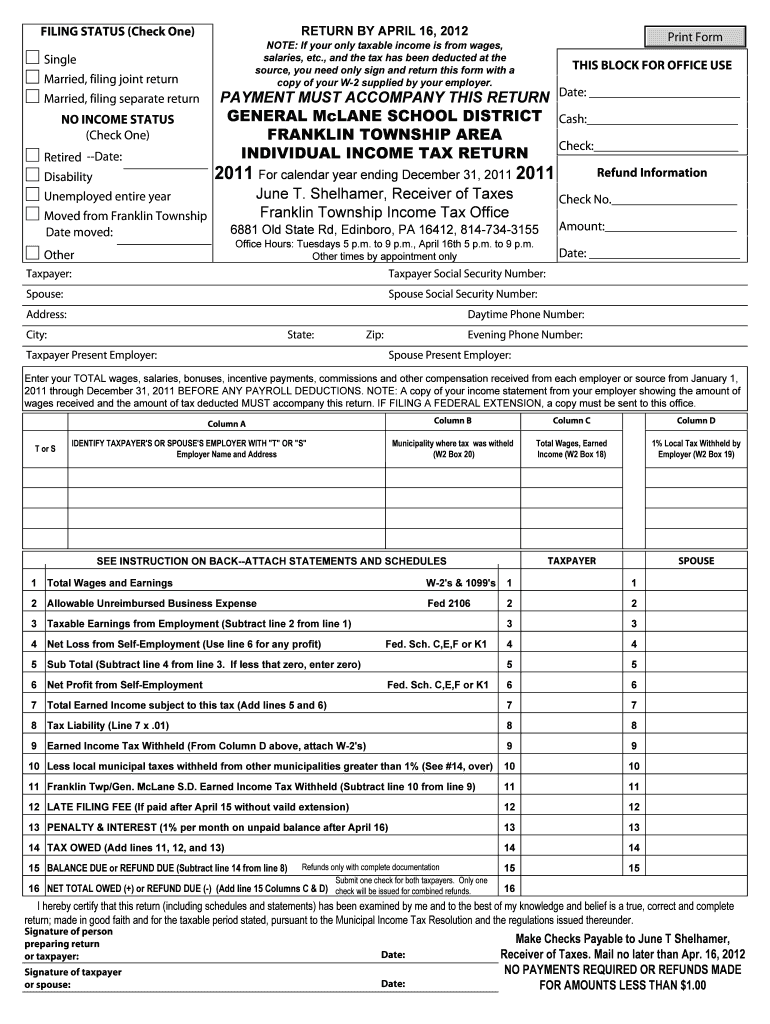 Residents of Franklin Township, Pennsylvania, who have earned income in the year 2011 are eligible to file this tax return. Both individual taxpayers and married couples can use the form.