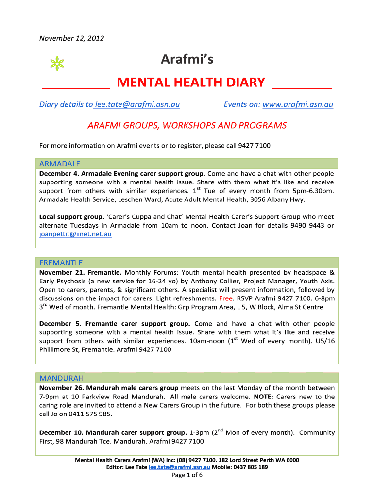 November 12, 2012, Artemis MENTAL HEALTH DIARY details to lee. Tate Arafat.ASN.AU Events on: www.arafmi.asn.au ARAFAT GROUPS, WORKSHOPS AND PROGRAMS For more information on Arafat events or to register,