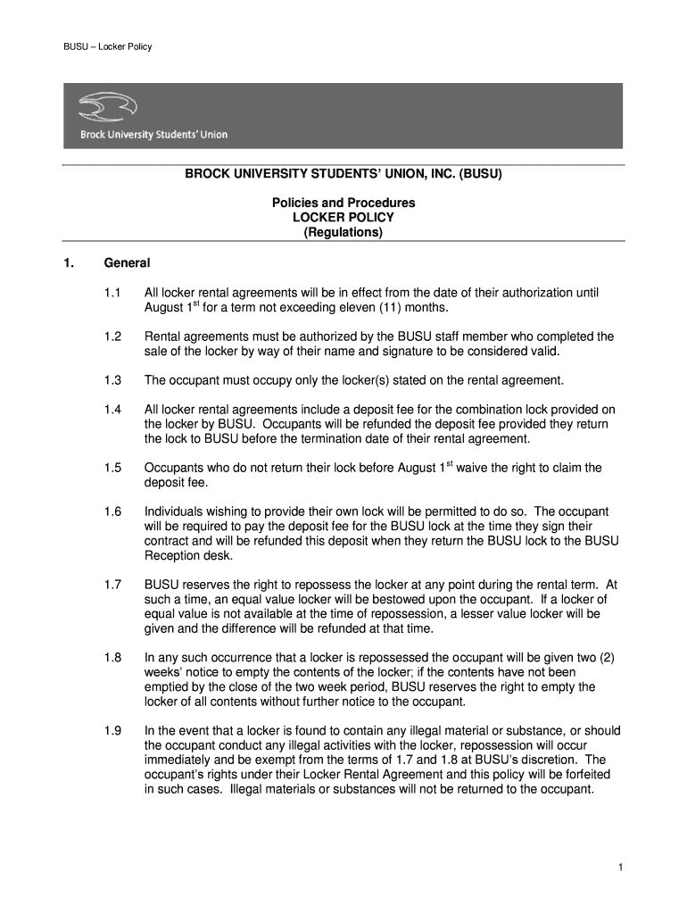 BUS Locker Policy BROCK UNIVERSITY STUDENTS UNION, INC. (BUS) Policies and Procedures LOCKER POLICY (Regulations) 1. General 1.1 All locker rental agreements will be in effect from the date of their
