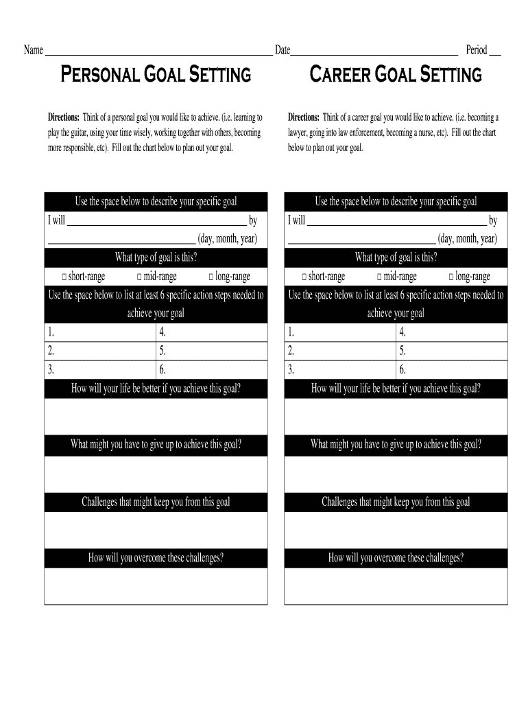 Name Date Personal Goal Setting Period Career Goal Setting Directions: Think of a personal goal you would like to achieve. (i.e. learning to play the guitar, using your time wisely, working together
