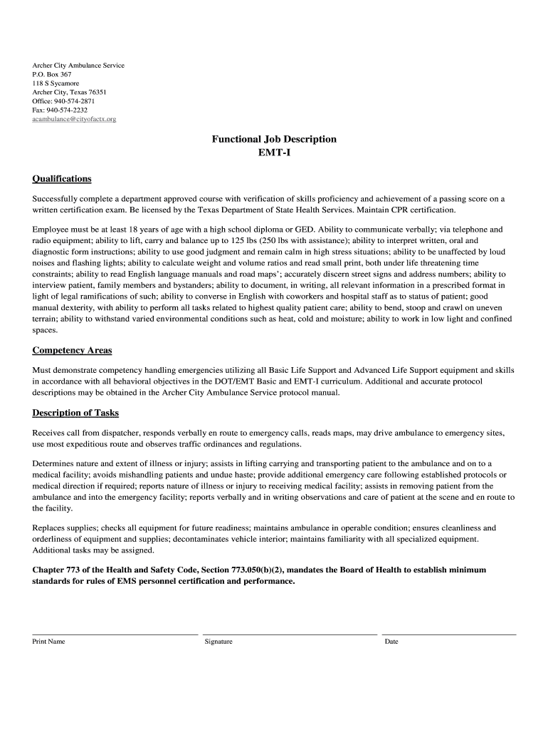 This document outlines the qualifications, competency areas, and tasks associated with the EMT-I position at Archer City Ambulance Service, including the necessary skills and operational protocols.