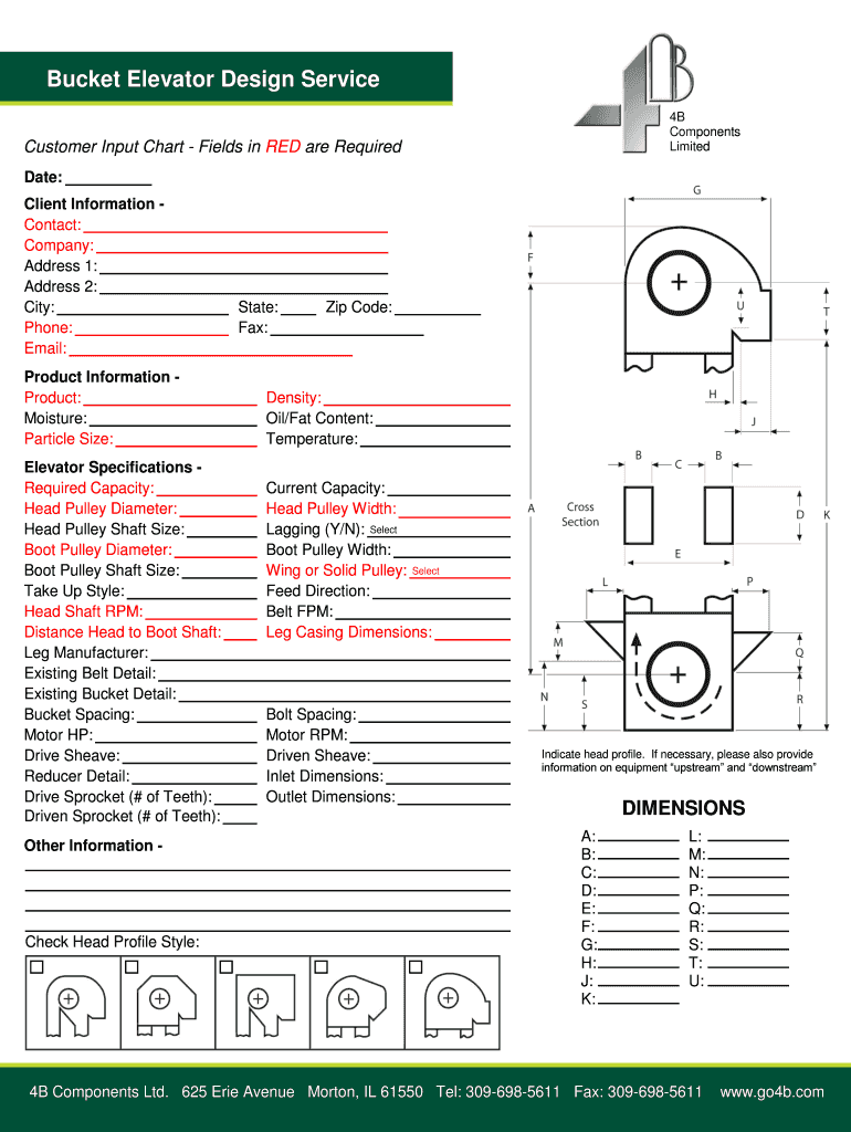 Bucket Elevator Design Service 4B Components Limited Customer Input Chart Fields in RED are Required Date: Client Information Contact: Company: Address 1: Address 2: City: Phone: Email: Product Information