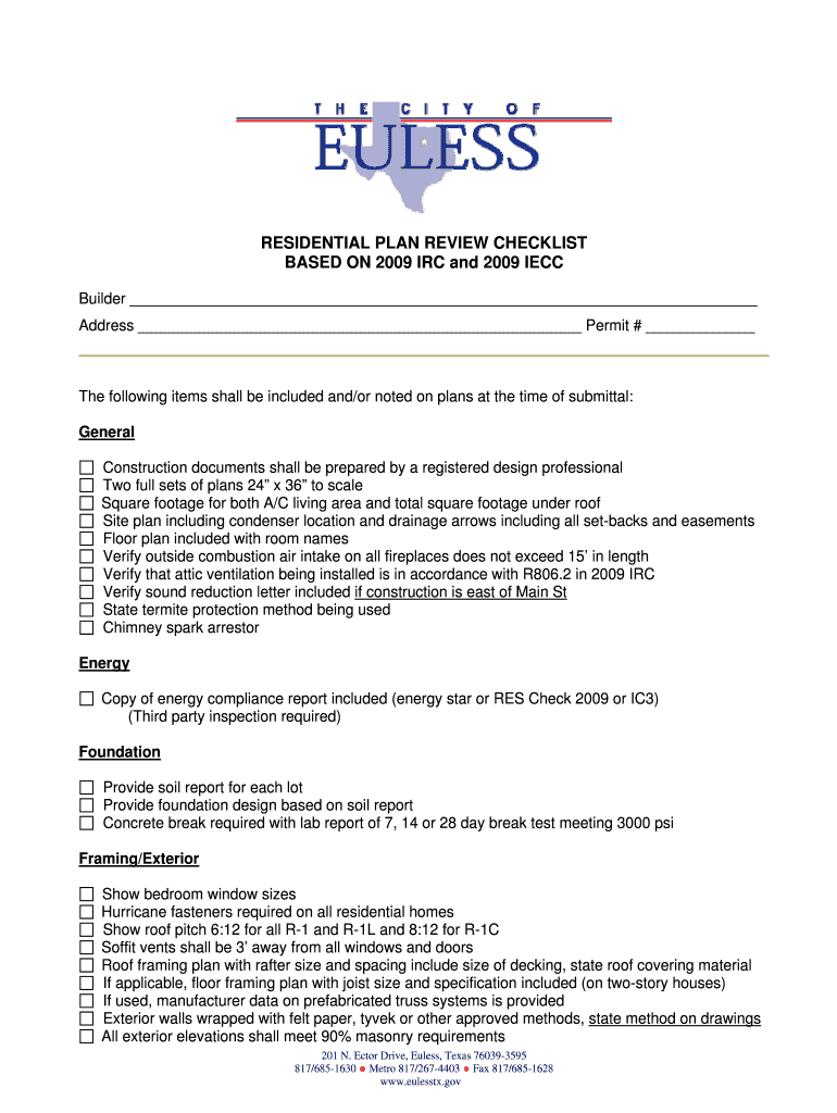 The Residential Plan Review Checklist can be used by anyone applying for residential construction permits in Texas, including homeowners, contractors, and architects.