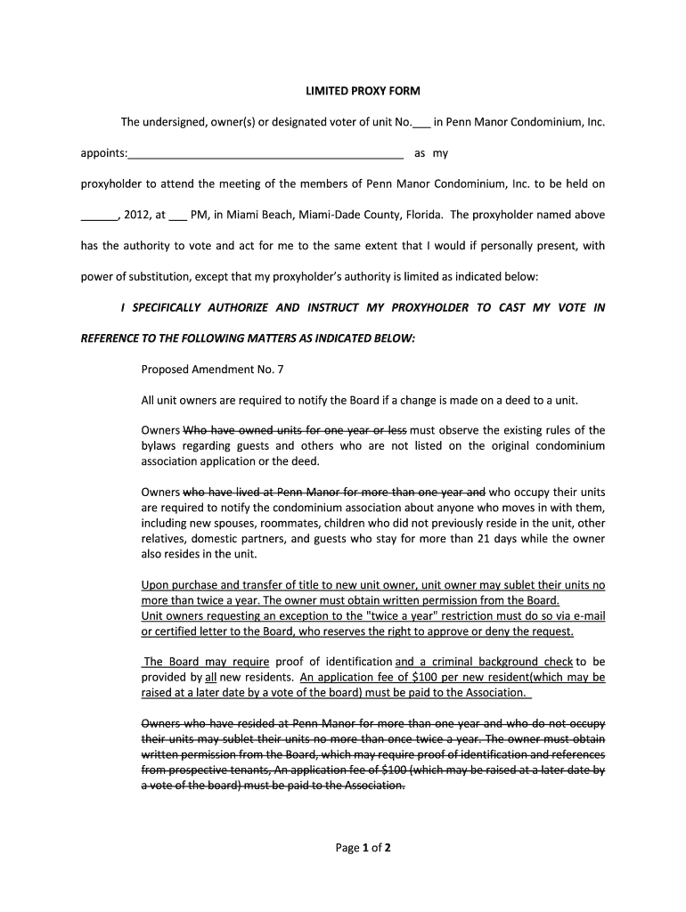 LIMITED PROXY FORM The undersigned, owner’s) or designated voter of unit No. in Penn Manor Condominium, Inc. appoints: as my proxy holder to attend the meeting of the members of Penn Manor Condominium,