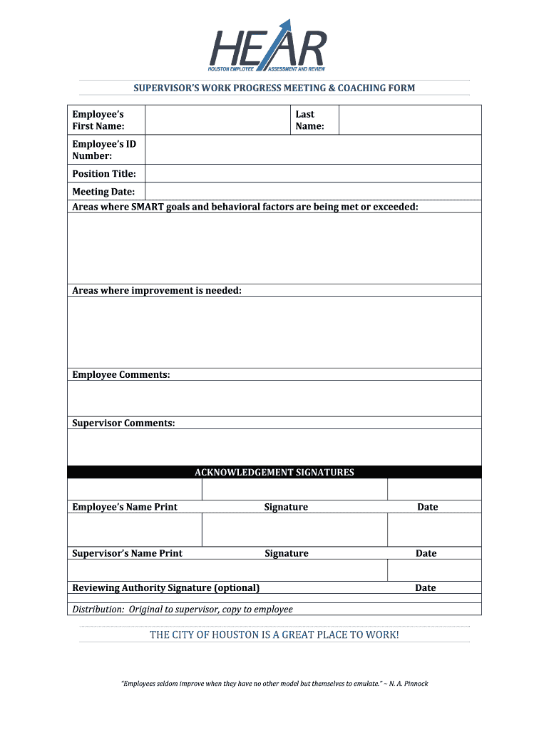 The Supervisor’s Work Progress Meeting & Coaching Form serves to document and review employee performance effectively. This form is essential for supervisors and employees within the City of Houston, ensuring a structured approach to performance evaluation. It is mandatory for both the employee and supervisor to sign the form, reflecting mutual agreement on the content.