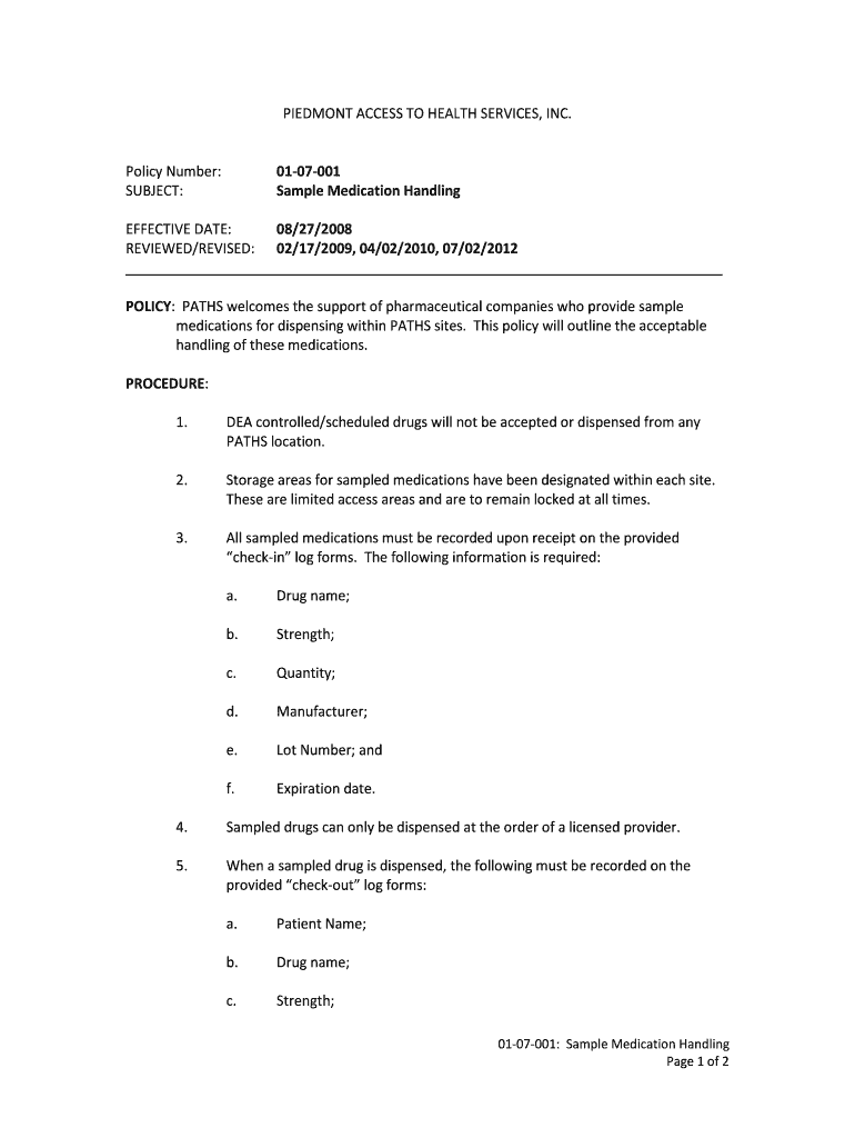 PIEDMONT ACCESS TO HEALTH SERVICES, INC. 0107001 Sample Medication Handling Policy Number: SUBJECT: EFFECTIVE DATE: 08×27/2008 REVIEWED×REVISED: 02×17/2009, 04×02/2010, 07×02/2012 POLICY: PATHS