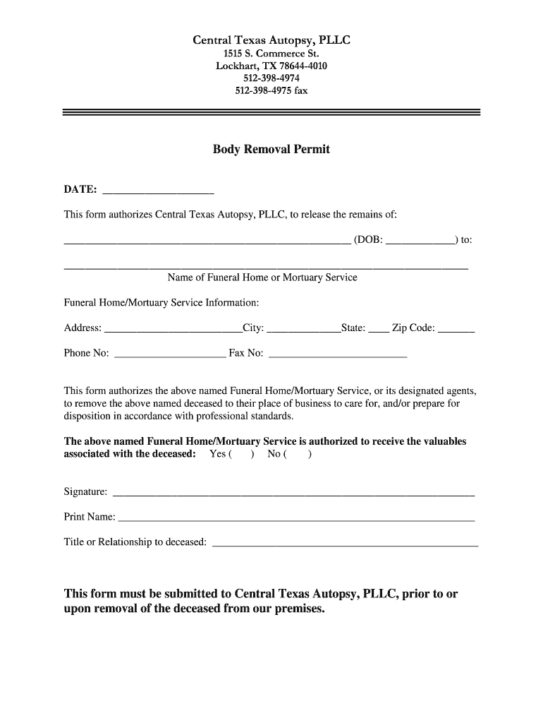 Body Removal Permit DATE: This form authorizes Central Texas Autopsy, LLC, to release the remains of: (DOB:) to: Name of Funeral Home or Mortuary