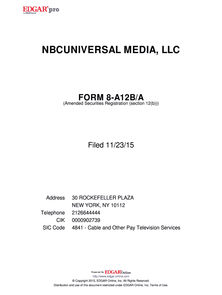 NBCUniversal MEDIA, LLC FORM 8A12B×A (Amended Securities Registration (section 12×b))) Filed 11×23/15 Address Telephone CIK SIC Code 30 ROCKEFELLER PLAZA NEW YORK, NY 10112 2126644444 0000902739