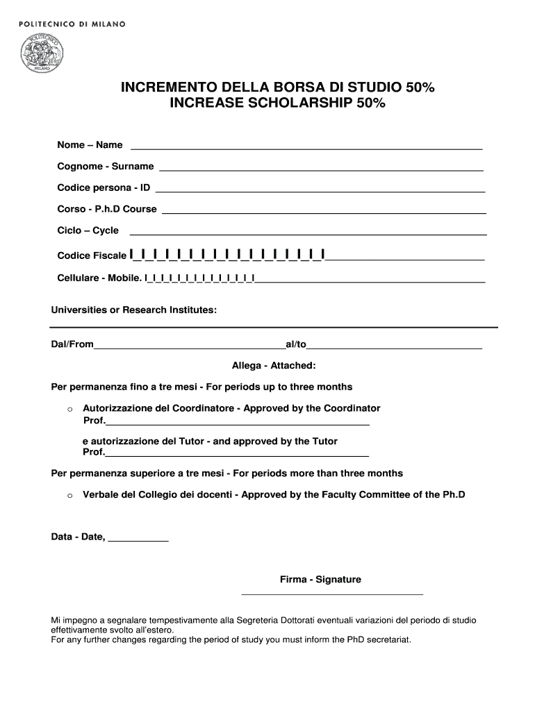 INCREMENT DELLA BURSA DI STUDIO 50% INCREASE SCHOLARSHIP 50% Nome Name Cognomen Surname Codices persona ID Torso P.h. D Course Cycle Codices Fiscal I I I I I I I I I I I I I I I I I Cellular Mobile.