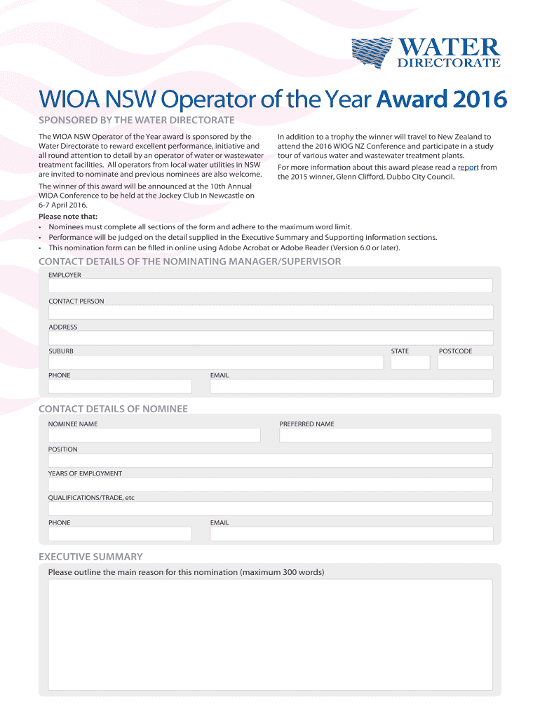 Get the free WIOA NSW Operator of the Year Award 2016 - waterdirectorate asn