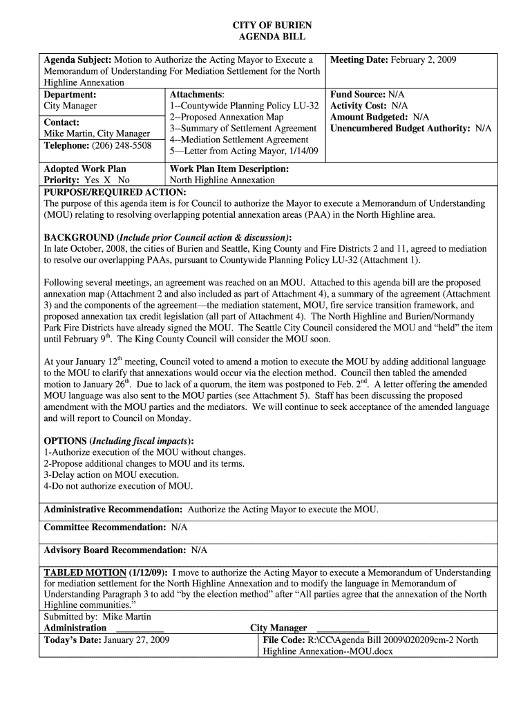 This document serves to authorize the Acting Mayor to execute a Memorandum of Understanding (MOU) to resolve overlapping potential annexation areas in the North Highline area, detailing mediation