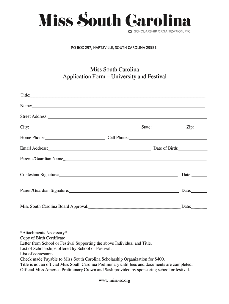 PO BOX 297, HUNTSVILLE, SOUTH CAROLINA 29551 Miss South Carolina Application Form University and Festival Title: Name: Street Address: City: Home Phone: State: Zip: Cell Phone: Email Address: Date
