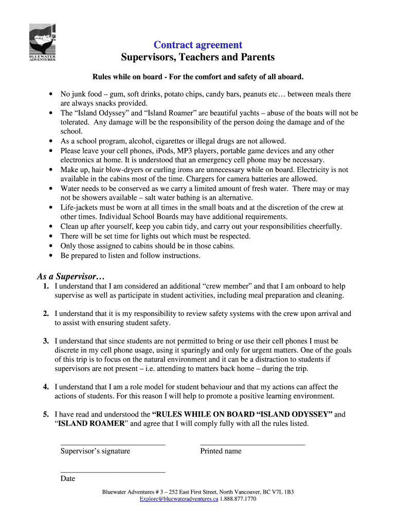 Contract agreement Supervisors, Teachers and Parents Rules while on board For the comfort and safety of all aboard. No junk food gum, soft drinks, potato chips, candy bars, peanuts etc between meals