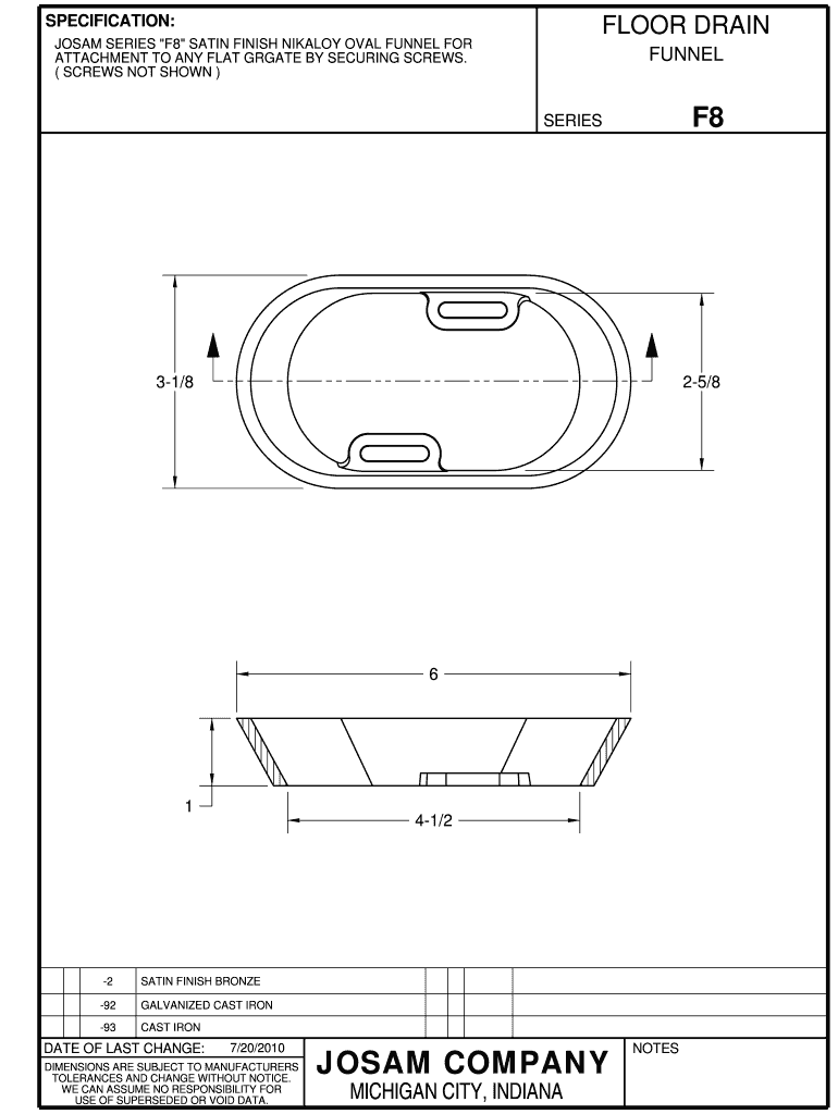 SPECIFICATION: FLOOR DRAIN JO SAM SERIES “F8 SATIN FINISH FINALLY OVAL FUNNEL FOR ATTACHMENT TO ANY FLAT GRATE BY SECURING SCREWS. (SCREWS NOT SHOWN) FUNNEL F8 SERIES 31×8 25×8 6 1 41×2 2 SATIN