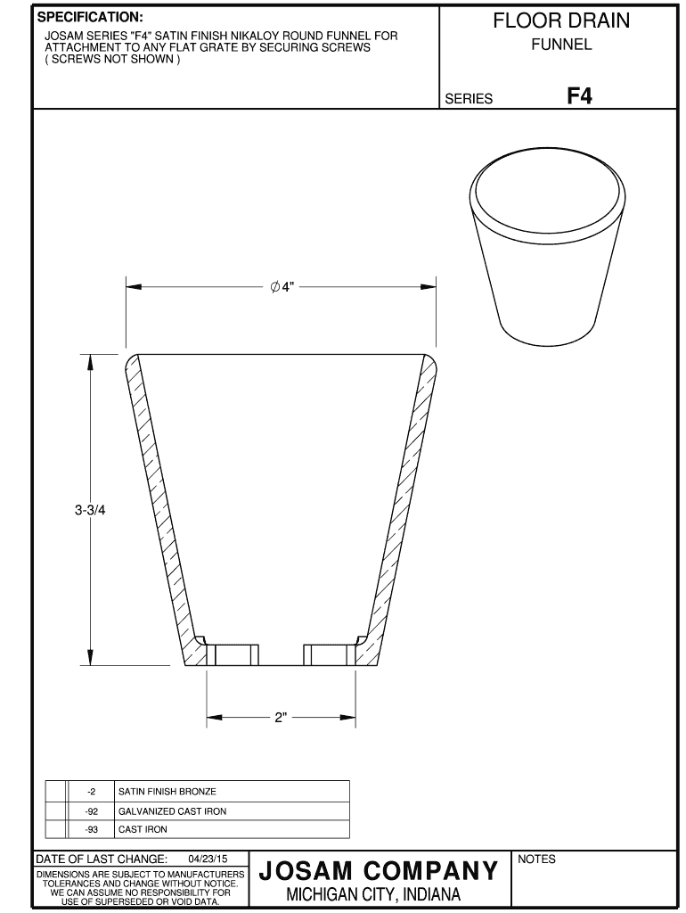 SPECIFICATION: FLOOR DRAIN JO SAM SERIES “F4 SATIN FINISH FINALLY ROUND FUNNEL FOR ATTACHMENT TO ANY FLAT GRATE BY SECURING SCREWS (SCREWS NOT SHOWN) FUNNEL F4 SERIES 4 33×4 2 2 SATIN FINISH BRONZE