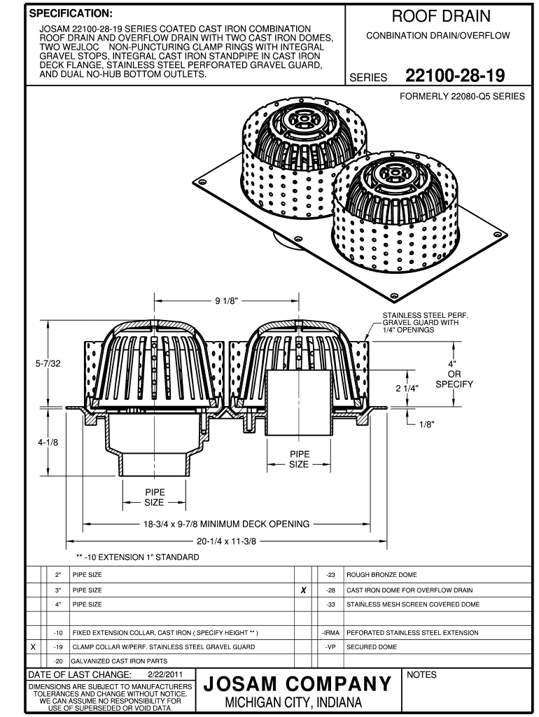 SPECIFICATION: ROOF DRAIN JO SAM 221002819 SERIES COATED CAST IRON COMBINATION ROOF DRAIN AND OVERFLOW DRAIN WITH TWO CAST IRON DOMES, TWO WEBLOG PUNCTURING CLAMP RINGS WITH INTEGRAL GRAVEL STOPS,