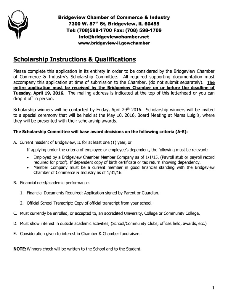 Bridge view Chamber of Commerce & Industry 7300 W. 87th St, Bridge view, IL 60455 Tel: (708×598-1700 Fax: (708) 598-1709 info bridgeviewchamber.net www.bridgeview-il.gov×chamber Scholarship Instructions
