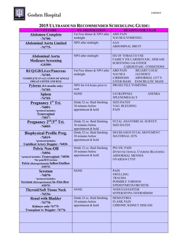 2×20/20152015 ULTRASOUND RECOMMENDED SCHEDULING GUIDE: US / CPT CODEAbdomen Complete 76700Abdominal Aorta Limited PT. PREPARATION Fat Free dinner & NPO after midnightREASONS FOR EXAM ABD PAIN NAUSEA×VOMITING