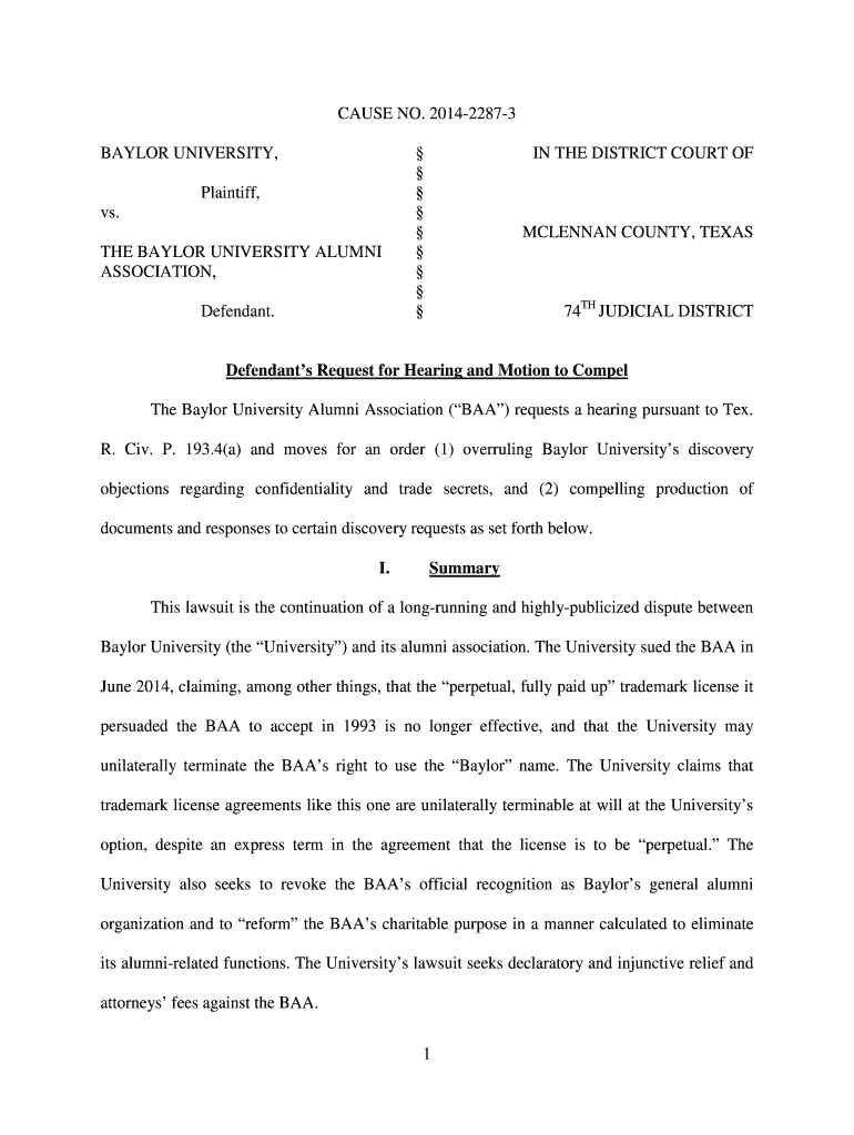 CAUSE NO. 201422873 BAYLOR UNIVERSITY, Plaintiff, vs. THE BAYLOR UNIVERSITY ALUMNI ASSOCIATION, Defendant. IN THE DISTRICT COURT OF MCLENNAN COUNTY, TEXAS 74TH JUDICIAL DISTRICT Defendants Request